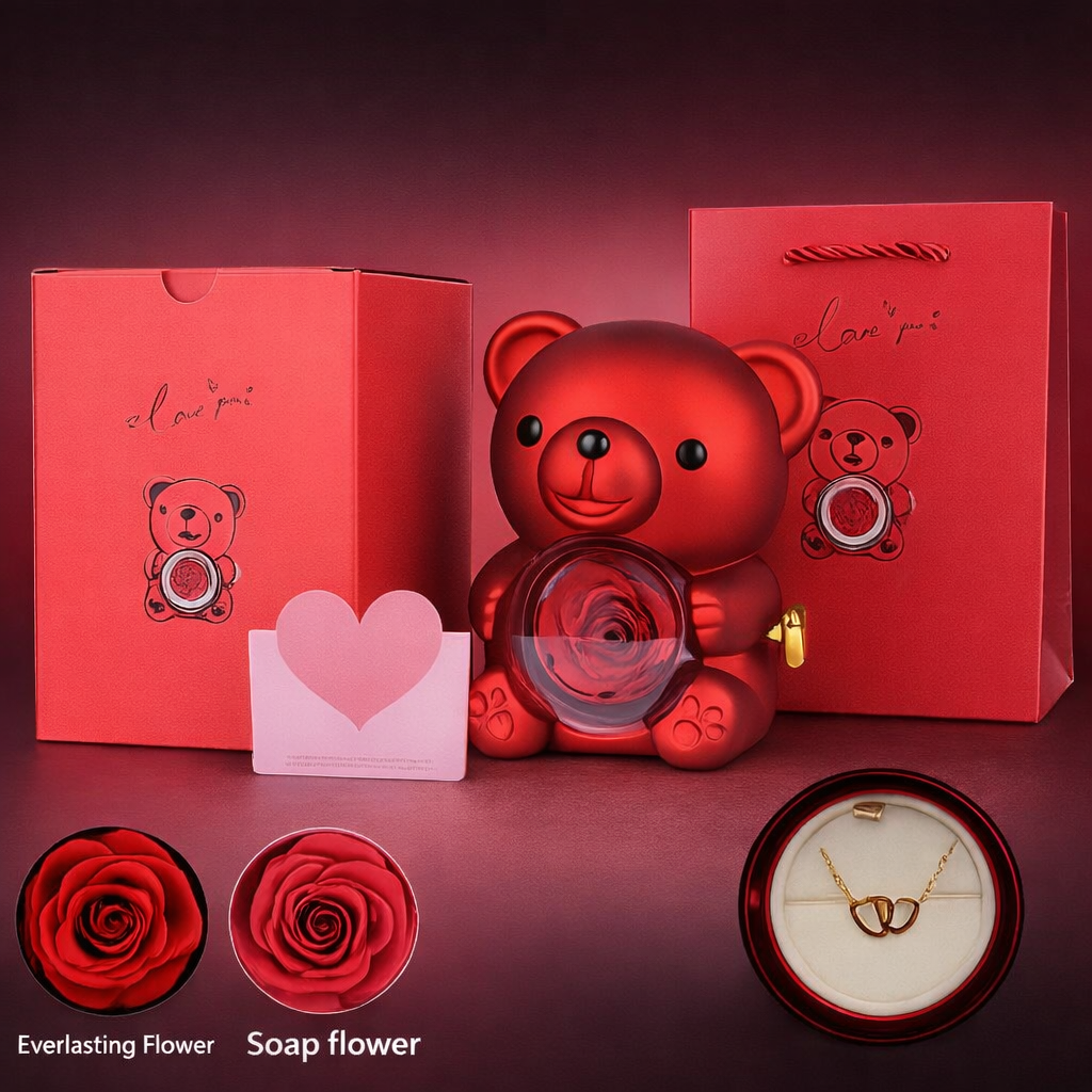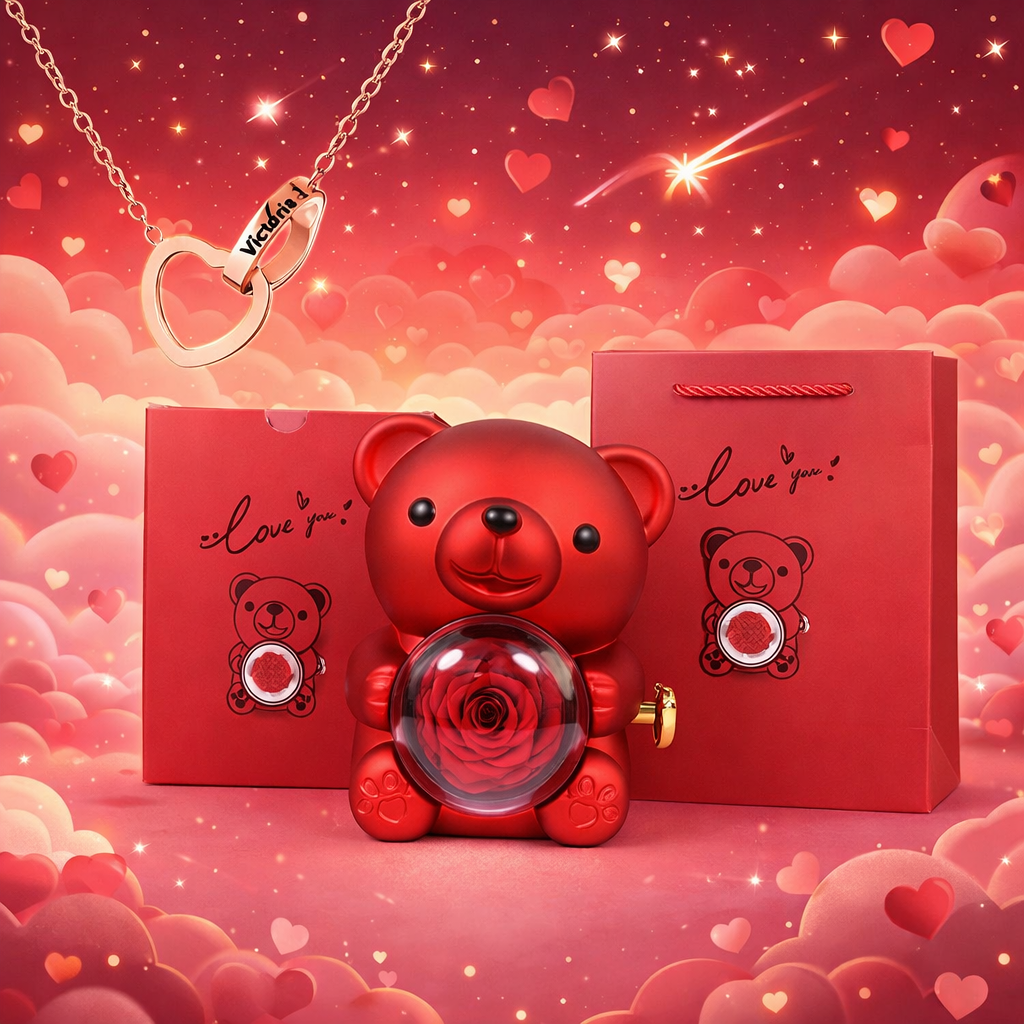 Idealny prezent, który mówi „kocham Cię” bez słów. Uroczy miś skrywa wieczną różę oraz elegancki naszyjnik — symbol miłości, który zostaje na zawsze. Perfekcyjny wybór na randkę, rocznicę lub Walentynki. 💍✨